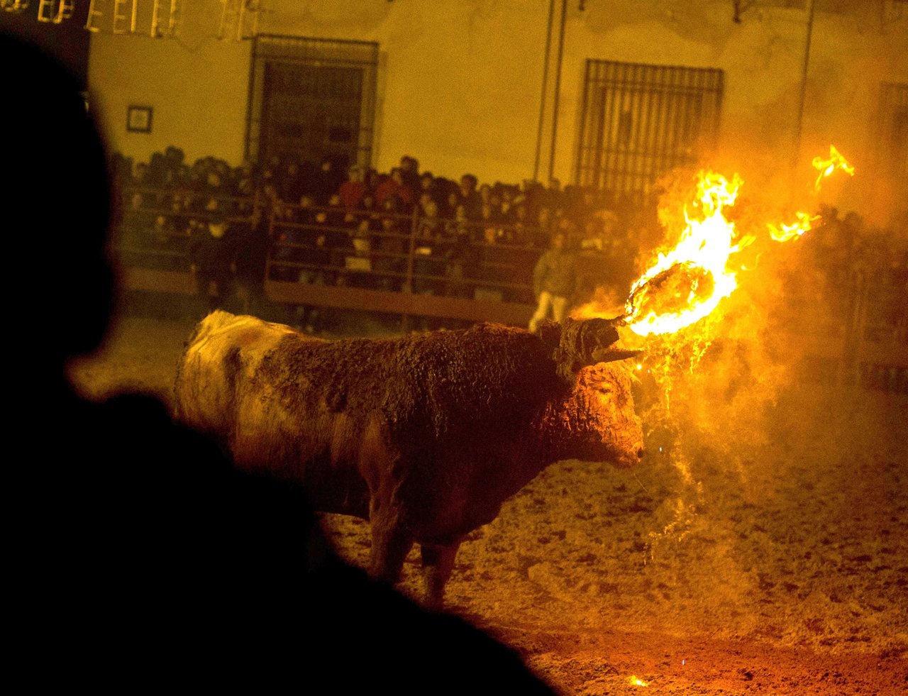 I den lilla spanska medeltidsstaden Medinaceli, en timmas körväg från Madrid, utspelar sig under denna helg ett groteskt scenario. Lördag kväll samlas stadens uppklädda invånare på det centrala torget som dagen till ära är omgjord till en liten inhägnad arena. Där tänder man eld på tjuren och folk jublar.
