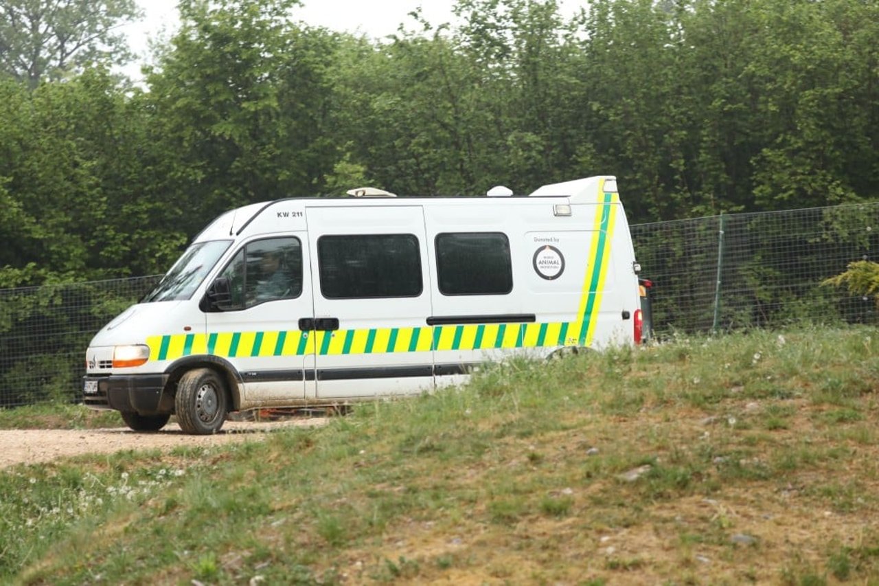 Plötsligt får vi signaler om att björnen är på väg. Vi ställer oss ute i ösregnet och ser den vita lastbilen närma sig. Det är inte bara vi och reservatspersonal utan även tv-journalister, både från rumänsk TV men också brittiska BBC.